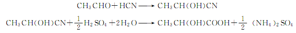 將乙醛和冷的氫氰酸連續(xù)送入反應器生成乳腈,再用泵壓入水解釜,并加入水和催化水解得乳酸;加酯化后精餾分出乳酸乙酯;后送入濃縮罐加熱分解而得精乳酸。