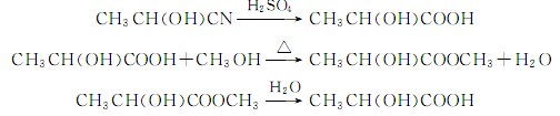(2)丙烯腈法 丙烯腈水解得粗乳酸,再經(jīng)甲醇酯化后水解得乳酸: